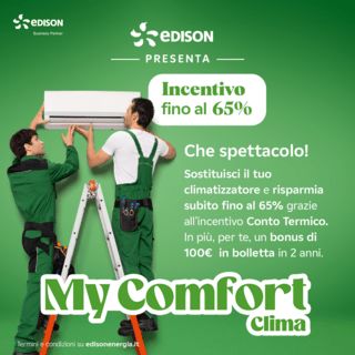 Per la tua climatizzazione estiva ed invernale scegli Edison My Comfort Clima! Acquista il tuo nuovo climatizzatore con finanziamento a tasso zero, puoi ottenere un recupero fino al 65% in bolletta.